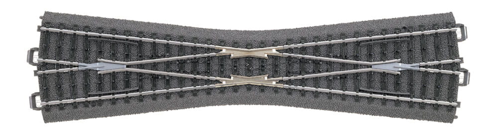 Kreuzende Strecken elektrisch getrennt. An den Enden der Kreuzung werden 4 Gleise 24071 benötigt (nicht in 24740 enthalten). 2 passende Böschungskeile liegen bei