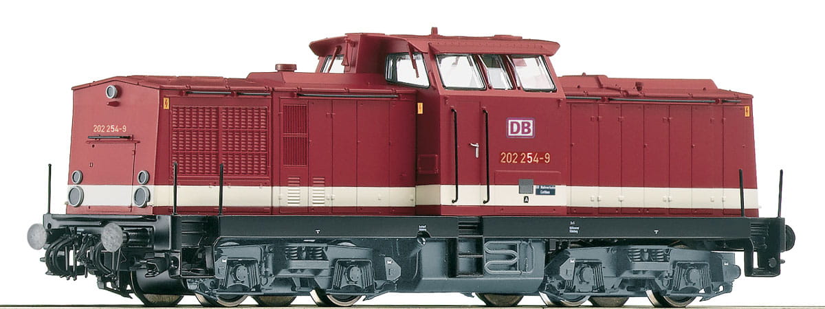 Diesellokomotive Baureihe 202 der DB AG, Epoche V, in bordeauxroter Farbgebung.