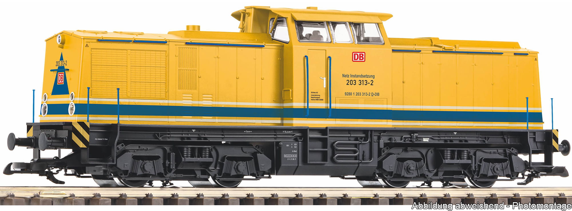 Die BR 203 DB Netz in Epoche V. Das Modell verfügt über einen Sound-Decoder. Der Baureihe 203 werden Diesellokomotiven zugeordnet, die aus Maschinen der DR-Baureihe V 100 umgebaut wurden und eine Höchstgeschwindigkeit von 100 km/h erreichen. Im Fuhrpark des Dienstleisters für Bahninfrastruktur DB Bahnbau Gruppe waren sie vornehmlich vor Bau- und Materialzügen in ganz Deutschland und Europa im Einsatz.