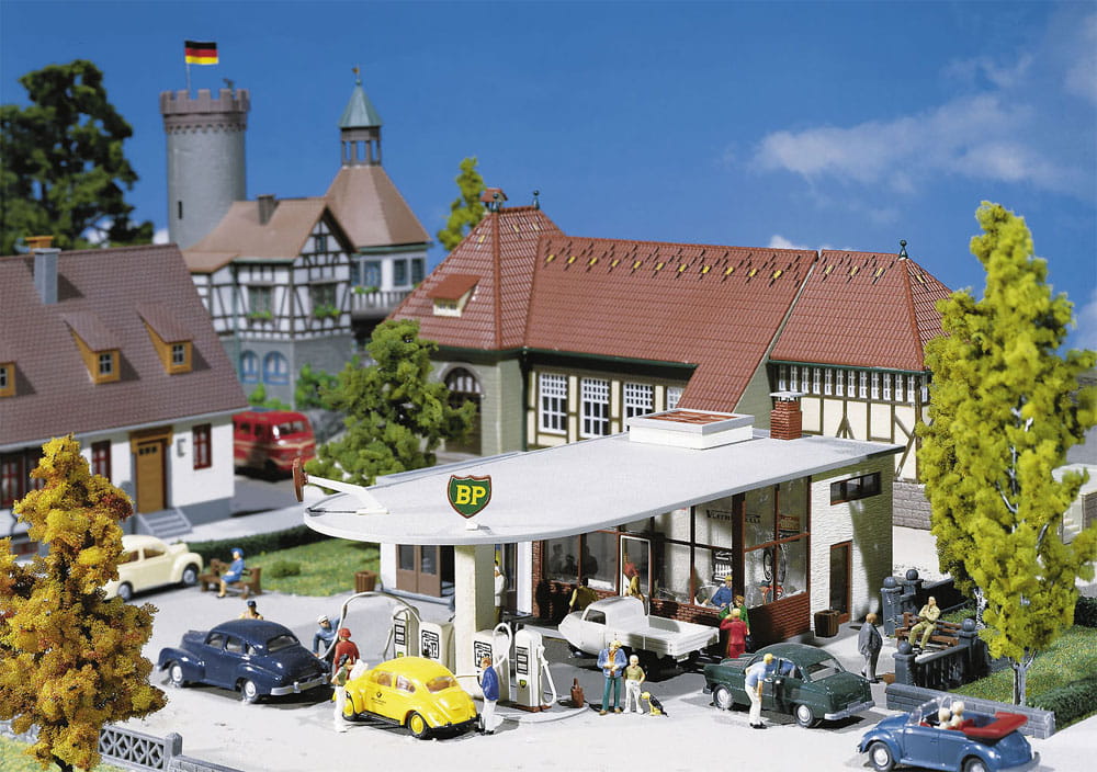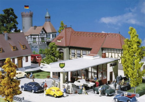 BP-Tankstelle, Epoche II, im Baustil der 50er Jahre mit runder Tanksäulenüberdachung, Kassenraum und den typischen BP-Zeichen auf dem Dach