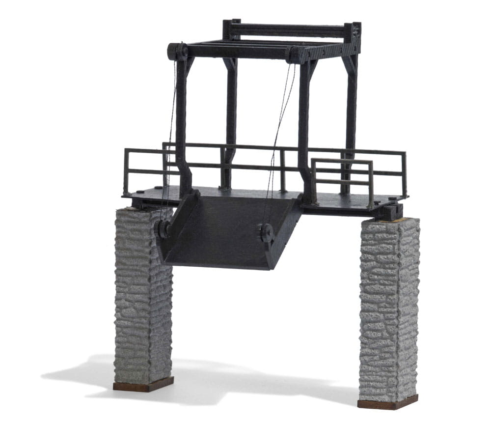 Mit klappbarer Schütte zur Verladung von Schüttgut. Inkl. 2 Pfeilern 46 mm hoch. Länge ohne Pfeiler 66,6 mm, ca. 90 mm Gesamthöhe. Bausatz