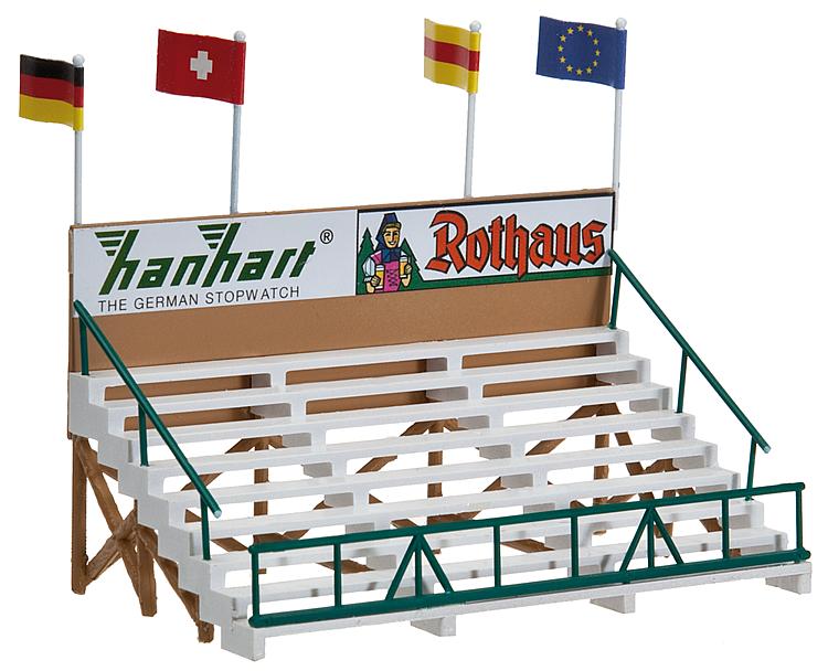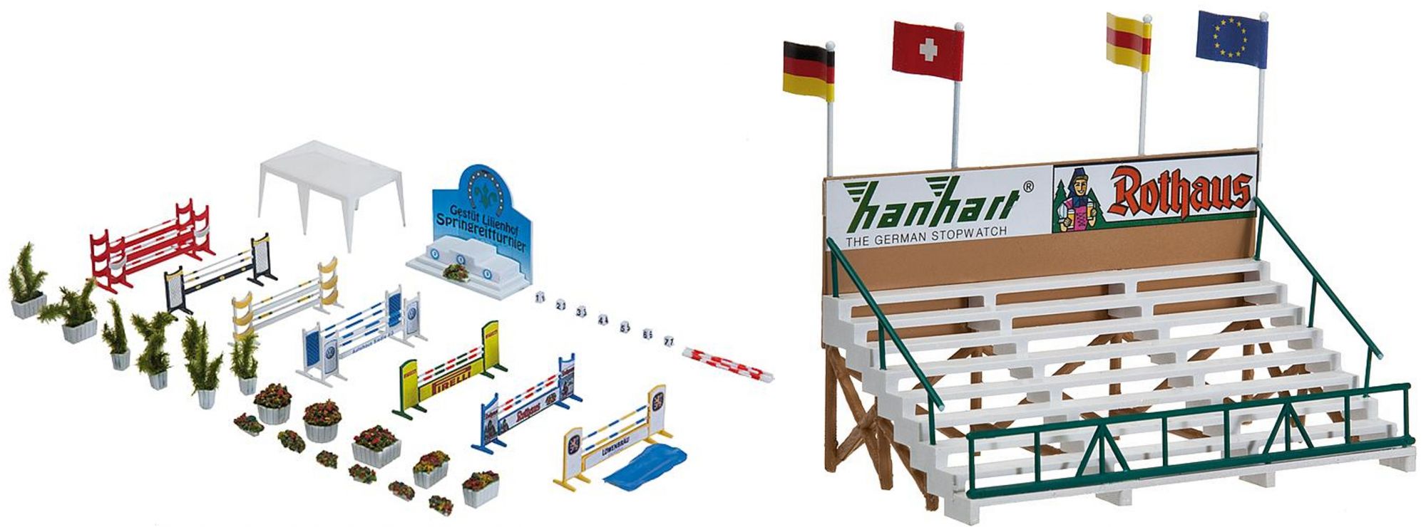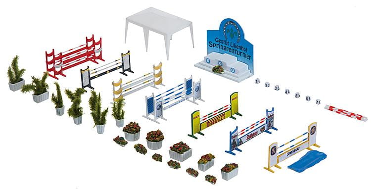- Reitturnier-Platz mit Rasenfläche, Umzäunung, Zuschauertribüne, diverse Hindernisse, Catering-Zelt und Ausschmückungsteilen.