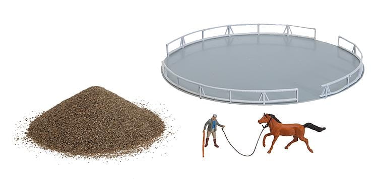 - Longierplatz mit Grundfläche, Streumaterial, Umzäunung, Trainer-Figur und Reitpferd.