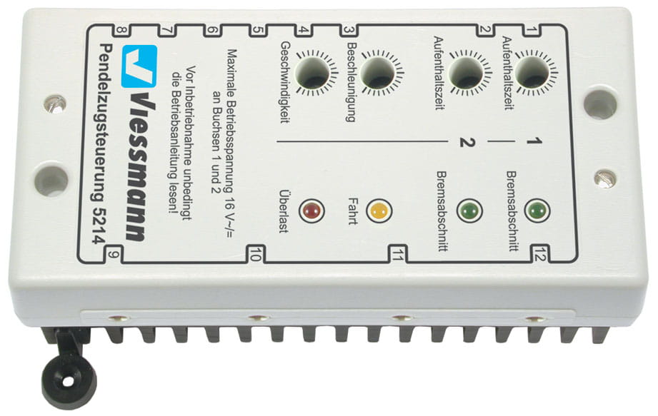 Ermöglicht den automatischen Verkehr eines Zuges zwischen zwei Endbahnhöfen. - Einfachster Anschluss (nur 4 Kabel) - keinerlei Schaltkontakte erforderlich, der Standort des Zuges wird über eingebaute Gleisbesetztmelder erkannt - aktuelle Betriebszustände werden über 4 LEDs angezeigt - langsames Anfahren und Bremsen - Aufenthaltszeiten für beide Endbahnhöfe separat einstellbar - integrierte Lichtsignalsteuerung mit weichem Signalbildwechsel, wie beim Vorbild - umschaltbar zwischen Halb- und Vollautomatik, bei Halbautomatik können die Züge über Taster manuell gestartet werden. - kein Regeltrafo nötig, Anschluss erfolgt direkt an 10-16 V Gleich- oder Wechselspannung. Da der Fahrbetrieb mit Gleichstrom erfolgt, ist kein Betrieb mit Wechselstrom- (Märklin) und Digital-Lokomotiven möglich.