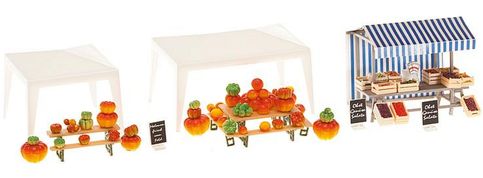 Charakterstische Obst- und Gemüsestände wie sie auf vielen Wochenmärkten landauf und landab anzutreffen sind. Mit vielen Kleinteilen.