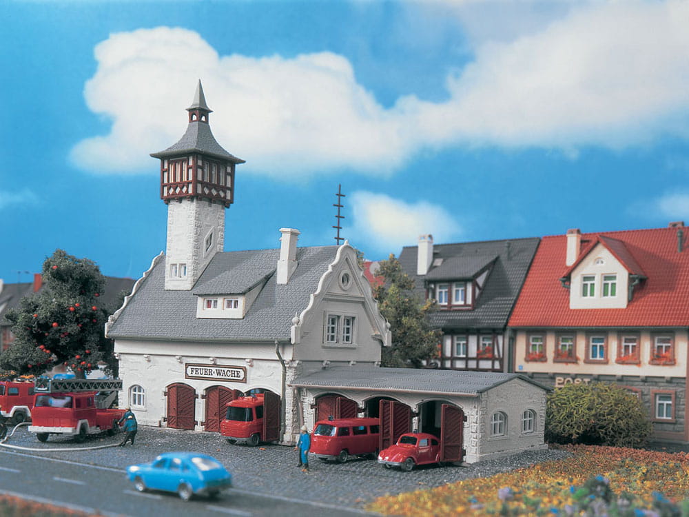 In diesem Gebäude finden 6 Einsatzfahrzeuge Platz. Der auffällig gestaltete Schlauchturm prägt dieses schmucke Gebäude. Maße: L 17,2 x B 5,5 x H 14 cm.