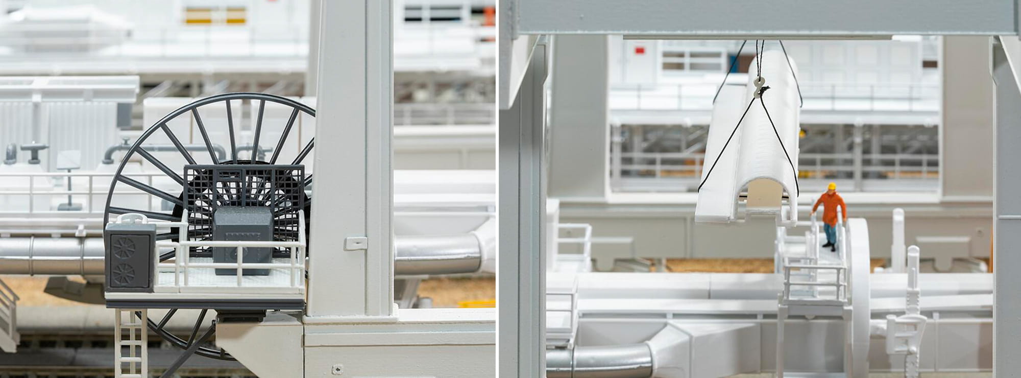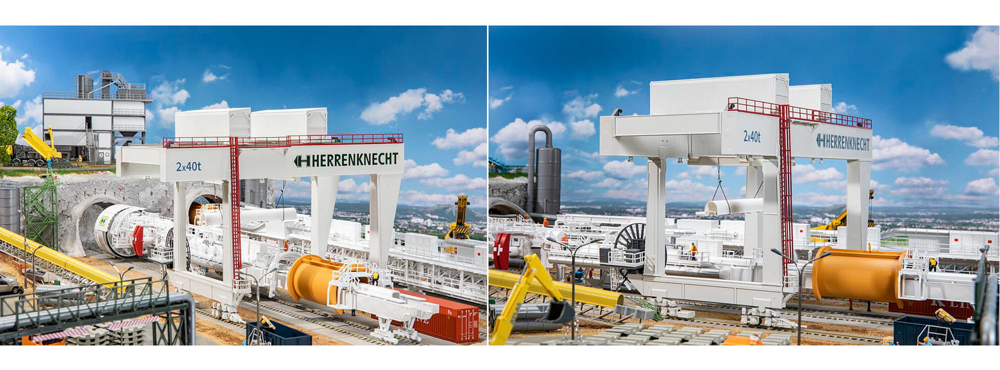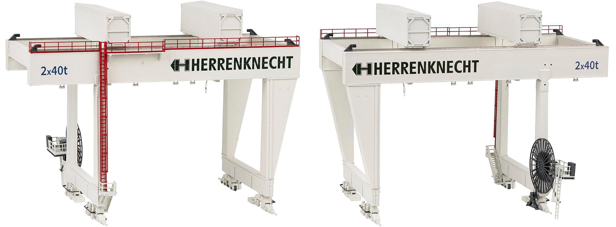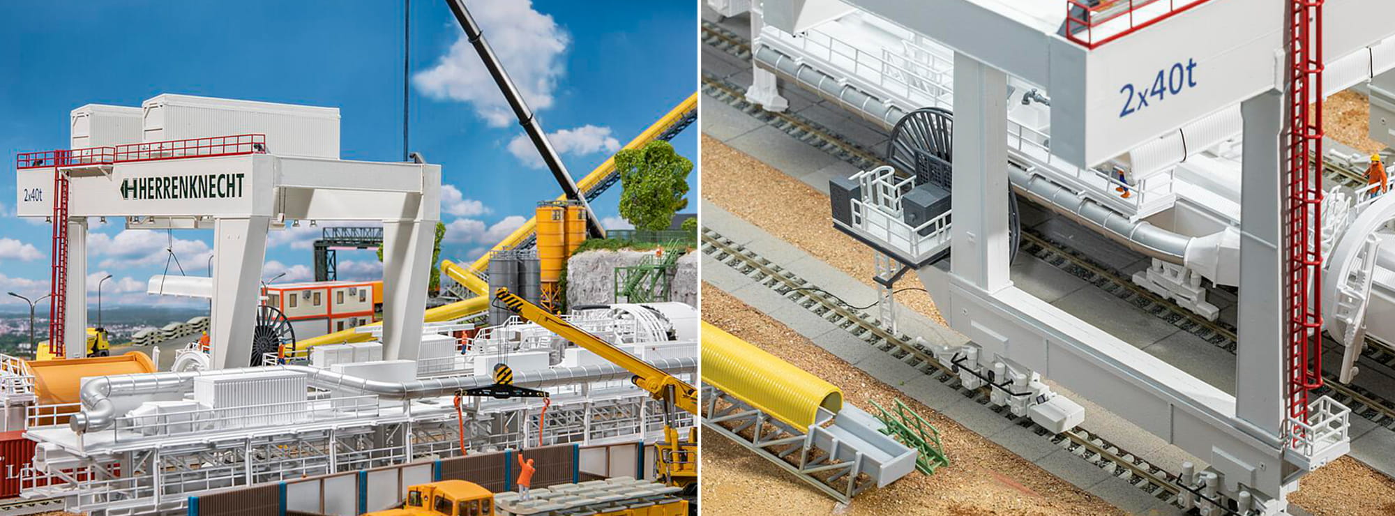Standmodell eines weißen, schienengebundenen Portalkrans mit Hebezeug und Laufkatze für vertikale und horizontale Hebevorgänge mit schweren Lasten, z. B. für die Montage von Tunnelvortriebsmaschinen auf Tunnelbaustellen. Typisierte Darstellung mit Aufdruck des »HERRENKNECHT«-Schriftzugs. Schienenprofile beiliegend. Modell ohne Funktion.