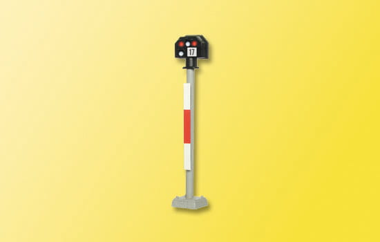 Signal der Einheitsbauart. Filigraner Messingmast in originalgetreuer Lackierung. Mit Steckfuß für einfache Montage. Mit je 2 roten und weißen LEDs, wartungsfrei. Signalbilder Sh0 und Sh1. Passendes Steuermodul: Art. 5221. Höhe: 3,5 cm.