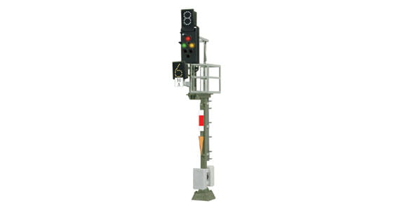 Ks-Mehrabschnittssignal als Einfahrsignal mit Geschwindigkeitsvoranzeiger (Zs3v), Geschwindigkeitsanzeiger (Zs3), Vorsignalfunktion und Zusatzlicht für verkürzten Bremswegabstand und 6 LEDs.