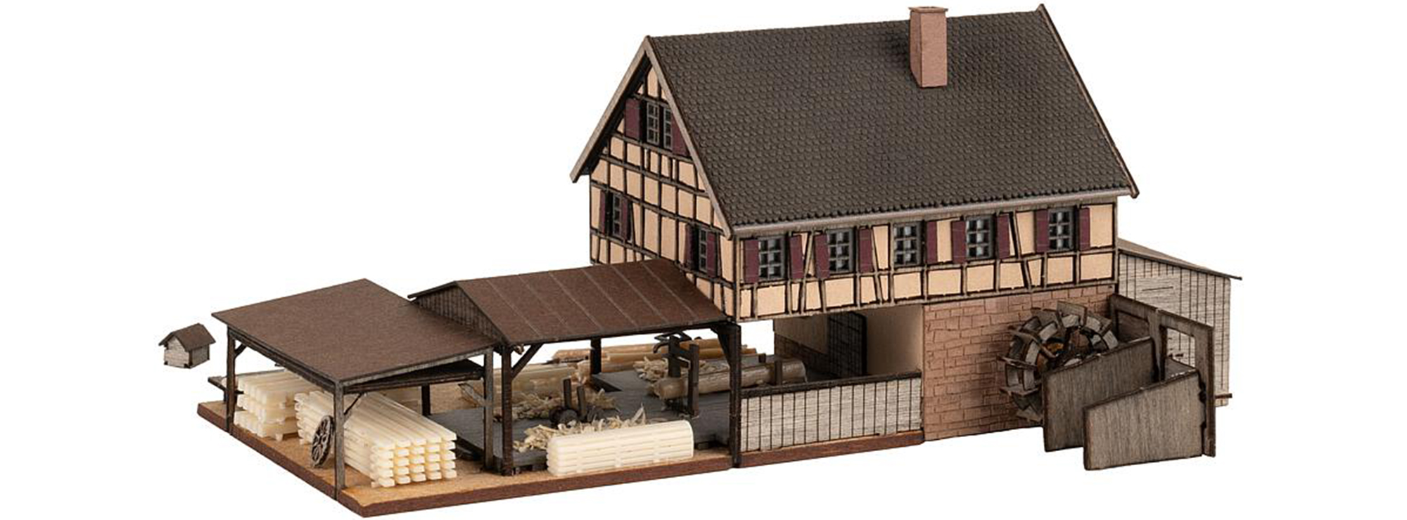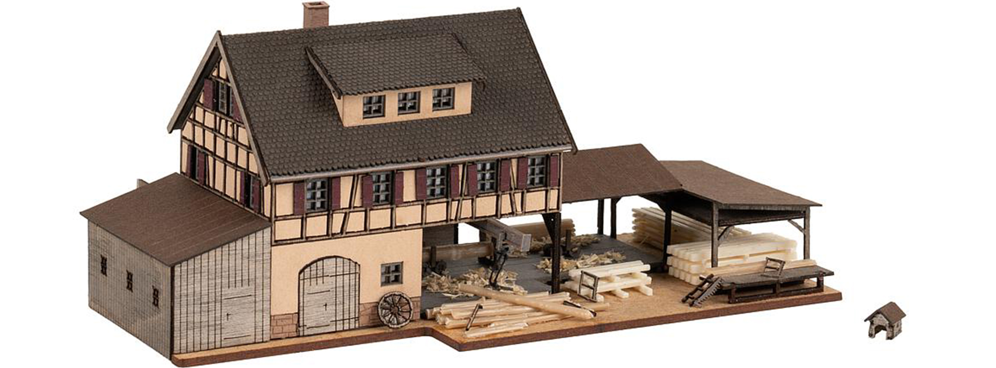 Der Geruch von frisch geschnittenem Holz und Sägespänen, das kräftige Rauschen eines Baches zusammen mit dem gleichmäßigen Klappern des Wasserrads ziehen über die alte Sägemühle mit ihren liebevollen Fachwerkelementen und roten Fensterläden hinweg. Eine kleine Hundehütte und allerlei Holzelemente vervollständigen das Miniaturmodell und fast kann man sich die fleißigen Miniatur-Arbeiter bei der Arbeit vorstellen. Eine perfekte Gelegenheit, um der Modellbauanlage etwas historisches Detail einzuhauchen.