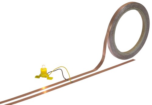 Selbstklebendes Kupferband zur Herstellung von elektrischen Verbindungen. Kupferband auf Grundplatte kleben und die Kabel von Beleuchtungssockeln, elektronischen Schaltungen, Relais, Motoren usw. einfach anlöten (oder antackern). Das Kupferband (6 mm breit, 0,035 mm dick, für Ströme bis max. 2A) kann mit Messer oder Schere geschnitten werden. 10 m Rolle
