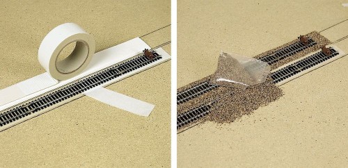 3 m Schotterband, 22 mm breit, zweiseitig selbstklebend. Ohne Schotter. Als Schotter geeignet sind z.B. alle Busch-Schottermischungen Nr. 7122-7129