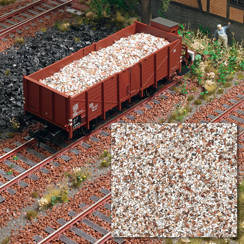 Mischung aus Steinchen in modellgerechter Größe für die Gestaltung von Kieswegen oder als Ladegut. Hervorragende Optik durch die authentische Farbmischung und unregelmäßiger Körnung.