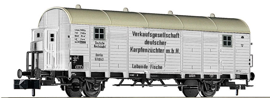 Modell vorbildgetreu lackiert und beschriftet. Mit 2 beweglichen Schiebetüren. Kupplungsaufnahme nach NEM 355 mit Kurzkupplungskulisse