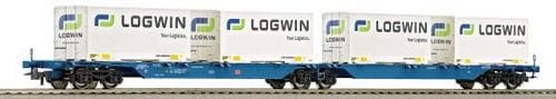Vorbild: Container-Doppeltragwagen der Deutschen Bahn AG (DB AG) im aktuellen Betriebszustand. Beladen mit 4 Wechselbehältern der Spedition LOGWIN. Fein detailliertes Modell mit abnehmbaren Wechselbehältern. LüP 390 mm.