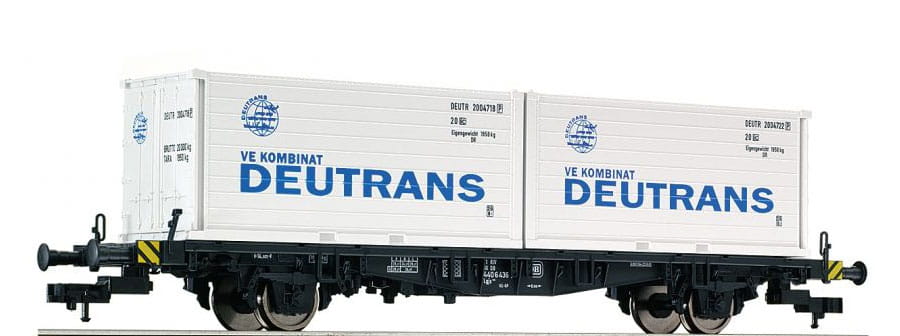 Container-Tragwagen, Bauart Lgjs 598, der DB, beladen mit 2 abnehmbaren 20" Containern der Firma "VEB Deutrans".