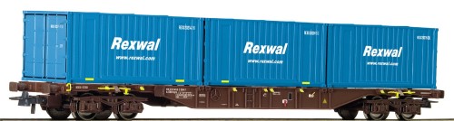 4-achsiger Containertragwagen Typ Sgns der Österreichischen Bundesbahnen (ÖBB), Epoche V, in aktuellem Betriebszustand. Beladen mit drei Open-Top Containern "Rexwal".