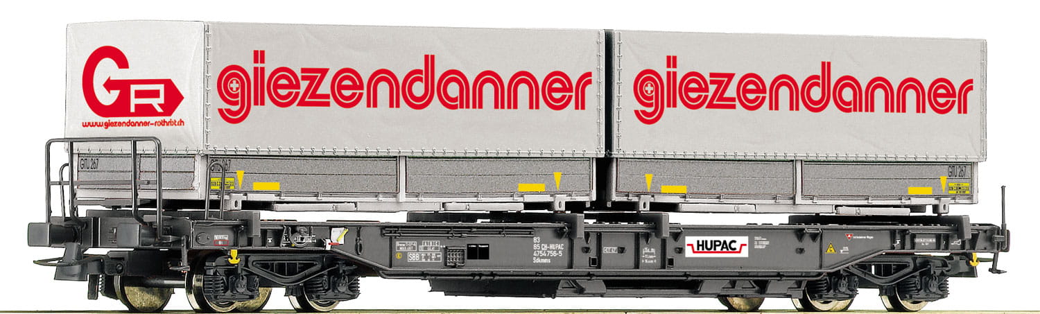 Modell: Fein detaillierte Ausführung mit zwei abnehmbaren LKW-Wechselbrücken. Mit NEM 362 Kupplungsaufnahme und Kurzkupplungskinematik. LüP 189 mm