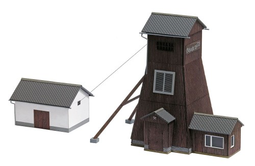 Bausatz für ein Fördergerüst aus Holz nach dem Originalvorbild des Schachtes 15IIb im heutigen Besucherbergwerk "Markus-Semmler-Stollen" im sächsischen Schlema. Mit separatem Maschinenhaus.