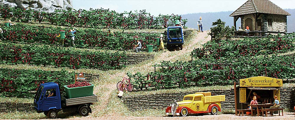 So perfekt wurden Weinstöcke noch nie im Maßstab 1:87 nachgebildet: Jeder einzelne Rebstock besteht aus dem Geäst mit daran hängenden Traubenrispen (15 Stück) und über 100 Blättern. Und trotz der Winzigkeit der einzelnen Blätter ist die typische Blattform des Weinlaubs gut erkennbar. Dieses Ausgestaltungsdetail darf auf keine Modellbahnanlage fehlen. Schon ein paar Rebstöcke in den Gärten gepflanzt bringen eine natürliche Belebung. Spektakulär ist natürlich ein richtiger Weinberg, der sich schon mit 2-3 Packungen gestalten lässt. Der passende Weinprobierstand wird mit den neuen Verkaufsbuden (1055) gestaltet. Bausatz für 20 Weinstöcke, einschließlich Grundplatten (ergibt eine Gesamtlänge von 40 cm bzw. 5 Reihen á 8 cm).