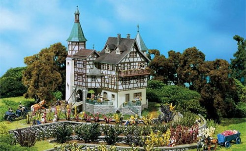 Mit diesem Modell hat der Modellbauer die Möglichkeit, ein Jagdschloss mit Holz-Zugbrücke, umgeben von einem Wasser- oder Schlossgraben, in seine Anlage einzubauen