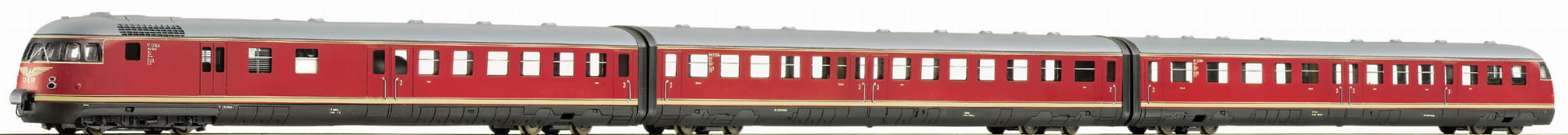 3-teiliger Dieseltriebzug VT 12.5 der Deutschen Bundesbahn (DB), Epoche III, im Betriebszustand nach der Auslieferung Anfang der 1950er Jahre. In klassischer roter Lackierung, mit roter Front und großem DB Flügelradlogo und 1./2./3. Klasse Beschriftung vor der Klassenreform der DB im Jahr 1956. Einsatz im Städteschnellverkehr.