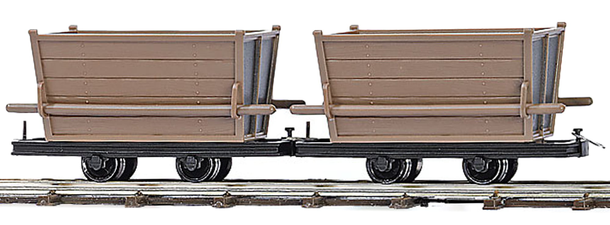 Diese Feldbahnwagen sind mit vorbildgetreuen Hakenkupplungen ausgestattet und daher auch mit den Loks und Mannschaftswagen aus dem Busch Grubenbahnsortiment kompatibel.