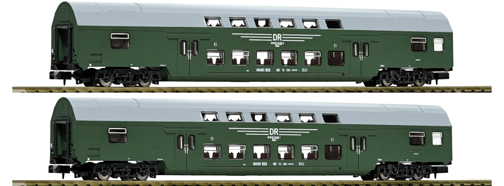 Wagenset 2 mit zwei Doppelstockwagen, Gattung DBmue, der Deutschen Reichsbahn.
