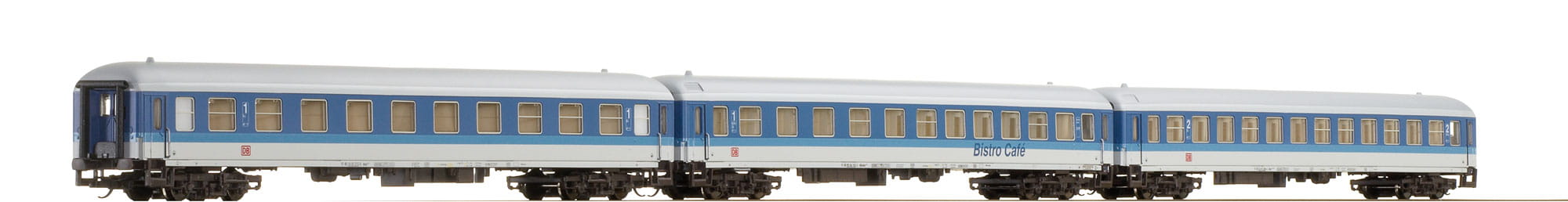 Bestehend aus drei m-Wagen (Am, Bm, Bistro-Wagen) mit neuen Wagennummern. Passend zu IR-Steuerwagen (Art. 13560).