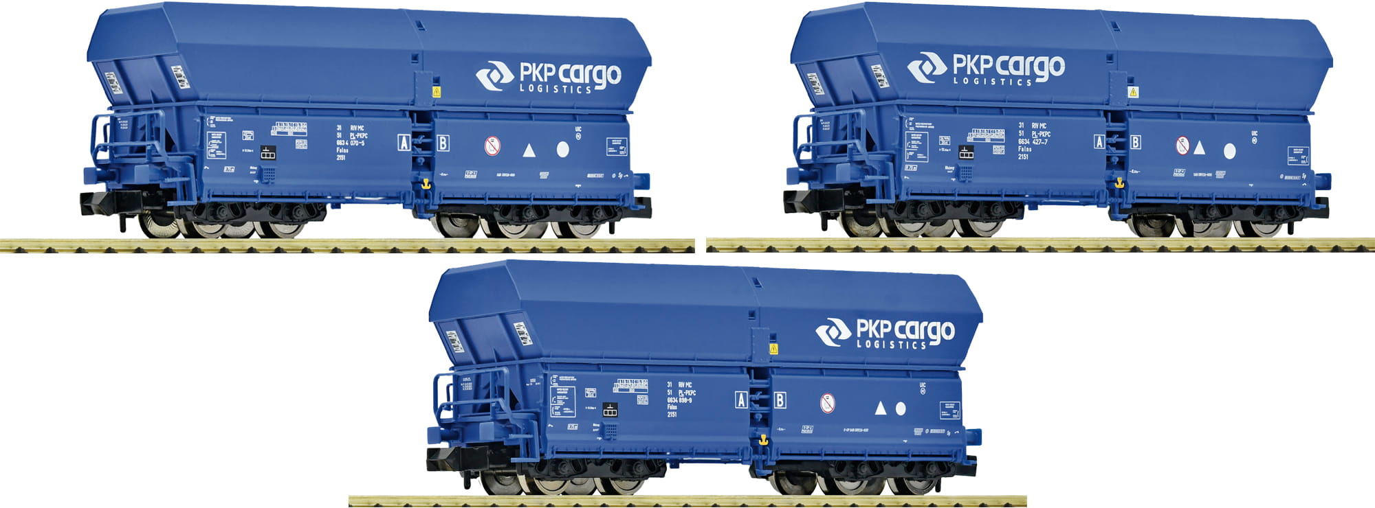 Wagenset mit drei Großraum-Selbstentladewagen, Gattung Falns, der PKP Cargo.