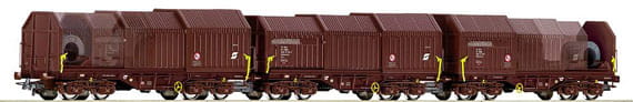 Drei 4-achsige Teleskophaubenwagen Bauart Shimmns der Österreichischen Bundesbahn (ÖBB). Epoche IV - V. Beladen mit Stahlcoils. Betriebszustand: 1980er Jahre. Einsatz: Transport von Stahlcoils.