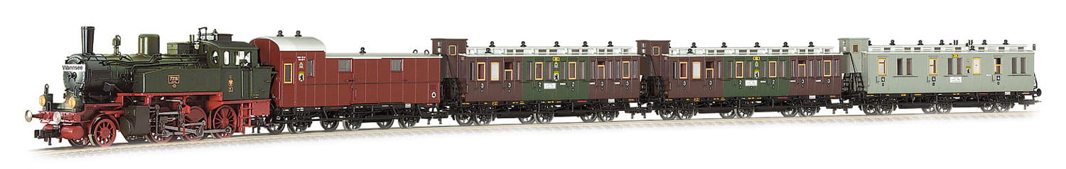 Modell: Das feinst bedruckte Set besteht aus einer Tenderlok, T 9.3, sowie 3 Personen- und 1 Gepäckwagen.