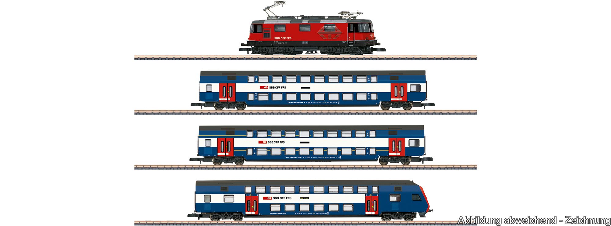 Vorbild: Zugpackung Züricher S-Bahn SBB EP. VI, bestehend aus Elektrolokomotive Re 420 aus dem Modernisierungsprojekt LION. 1 Doppelstockwagen 2. Klasse HVZ, 1 Doppelstockwagen 1./2. Klasse HVZ, 1 Doppelstock-Steuerwagen DBZplus Bt 2. Klasse.Alle Fahrzeuge im aktuellen Betriebszustand.