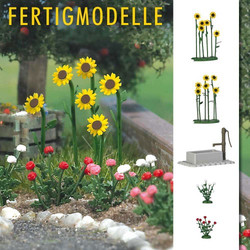 Je 12 auf Grundplatten fertig montierte Sonnenblumen (gelb) und Rosen (weiß und rot). Zusätzlich enthalten: Brunnen. Verpackung in Klarsicht Präsentationsbox