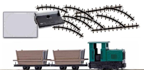 Das Start-Set beinhaltet 1 Feldbahnlokomotive, 2 Wagen, 8 Bogengleise Radius 115 mm, 1 gerades Gleis und 1 Anschlussgleis je 133,2 mm. Inkl. Batteriekasten mit Schalter (Vorwärts/Rückwärts/Stopp).