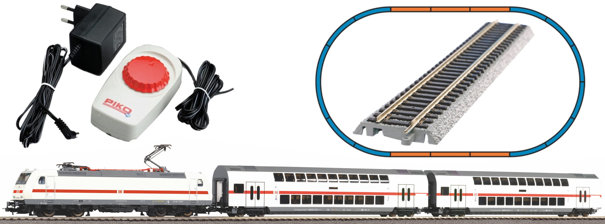 Das Set enthält eine E-Lok der BR 146 und 2 Doppelstockwagen sowie ein Oval mit PIKO A-Gleis mit Bettung.