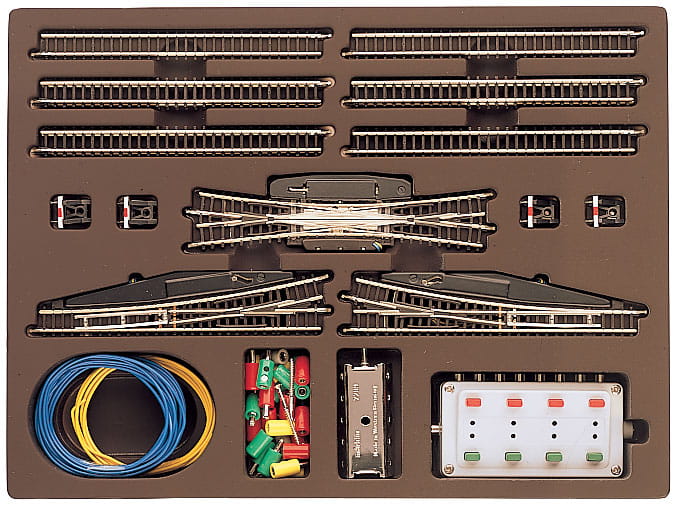 Inhalt: 10 gerade Gleise, 1 doppelte Kreuzungsweiche, 2 elektromagnetische Weichen, 4 Prellböcke, Stellpult, Verteilerplatte, Anschlussmaterial und Aufbauanleitung.