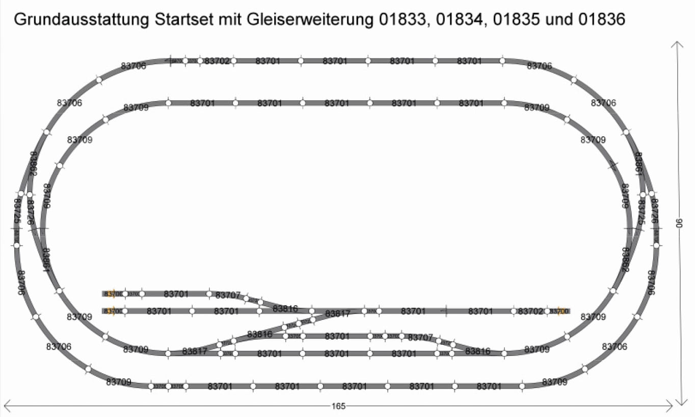 - eine Handweiche links (83817) mit Ausgleichsstück (83721)