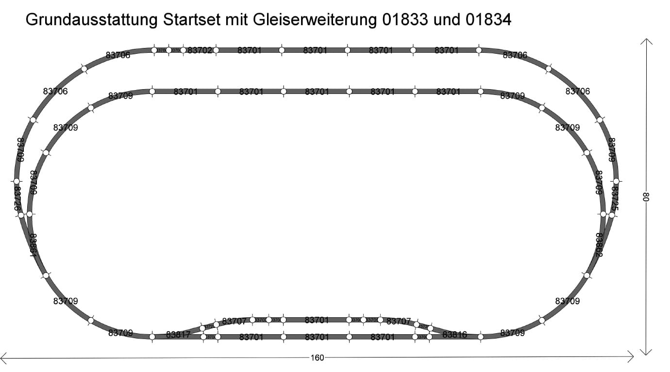 - eine Innenbogtenweiche links (83862) mit Ausgleichsstück (83725)