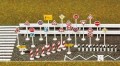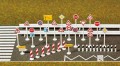30 Verkehrsschilder und Warnbaken, sowie 10 Leitplanken, 30 Begrenzungspfosten und Straßenmarkierungssymbole zum Anreiben von Zebrastreifen, Verkehrsinseln, Bushaltestellen, Parkplätzen usw