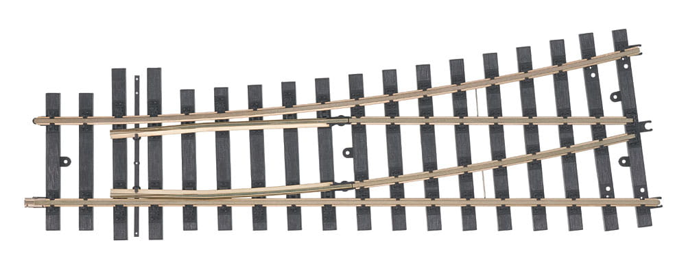 Abzweigwinkel 15°, Weichenzungen aus Metall, kombinierbar mit 59092, passender Weichenbock im Lieferumfang enthalten.